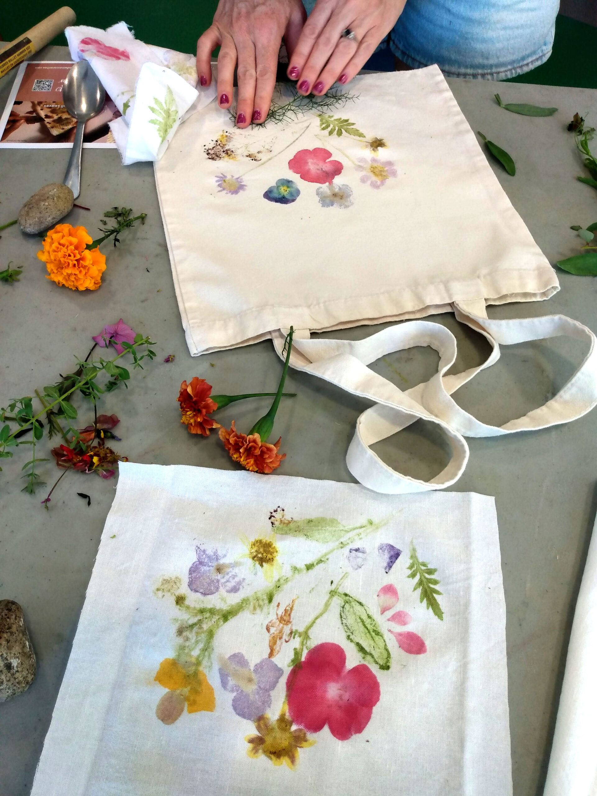Passo 4 - Retirando as plantas com o tecido já tingido em tons de rosa e amrelo pela impressão botânica